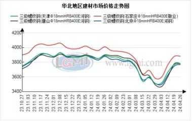 云商平臺(tái)監(jiān)測(cè)數(shù)據(jù)顯示,截至4月26日午間,天津市場(chǎng)Φ18mm三級(jí)抗震螺紋鋼價(jià)格為3780元,比上周同期價(jià)格漲10元;北京市場(chǎng)Φ18mm三級(jí)抗震螺紋鋼價(jià)格為3770元,比上周同期價(jià)格漲20元;唐山市場(chǎng)Φ18mm三級(jí)抗震螺紋鋼價(jià)格為3780元,比上周同期價(jià)跌10元;石家莊市場(chǎng)Φ18mm三級(jí)抗震螺紋鋼價(jià)格為3880元,與上周同期價(jià)格持平。