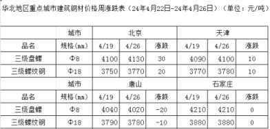 本周華北地區(qū)建材市場(chǎng)以穩(wěn)為主。在經(jīng)過連續(xù)兩周的持續(xù)快速上漲后,本周期現(xiàn)兩市上漲動(dòng)力明顯不足,期螺小幅震蕩,京津冀建材市場(chǎng)成交明顯減少,商家大都維穩(wěn)觀望。上周五資金炒作開始降溫,期螺小幅回落,周末各地成交明顯轉(zhuǎn)弱,市場(chǎng)交投冷清,唐山鋼坯價(jià)格也開始下跌,不過京津冀建材市場(chǎng)在經(jīng)過期現(xiàn)連續(xù)兩周的快速拉漲后市場(chǎng)信心較足,商家并不急于調(diào)整報(bào)價(jià),周末京津冀建材市場(chǎng)價(jià)格基本平穩(wěn)。周初開市,期螺小幅震蕩,唐山鋼坯止跌,市場(chǎng)成交一般,京津冀建材商家謹(jǐn)慎觀望,華北地區(qū)建材價(jià)格以穩(wěn)為主。周中期,期螺小幅震蕩偏弱,不過由于臨近“五一”假期,現(xiàn)貨端韌性強(qiáng)于期貨,市場(chǎng)主流并不看空,多數(shù)認(rèn)為回調(diào)有限,報(bào)價(jià)依然較堅(jiān)挺,甚至有部分商家小幅上調(diào)報(bào)價(jià)惜售,希望借“五一”假期之勢(shì)拉高節(jié)前價(jià)格,華北地區(qū)建材市場(chǎng)穩(wěn)中偏強(qiáng)運(yùn)行。周后期,期螺仍未出現(xiàn)反彈,相反,期螺震蕩幅度加大,京津冀建材商家操作更加謹(jǐn)慎,報(bào)價(jià)維穩(wěn)觀望,華北地區(qū)建材市場(chǎng)價(jià)格以穩(wěn)為主。