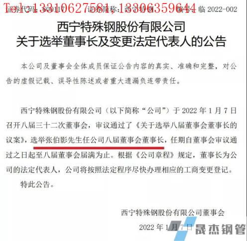 張伯影先生:1970年7月出生,漢族,中共黨員,中國國籍,河北人,大專學歷,工程師,歷任西寧特殊鋼股份有限公司煉鋼分廠一煉作業區作業長、煉鋼分廠廠長、煉軋分廠廠長、轉爐分廠廠長、三煉分廠廠長、鍛鋼分廠廠長、資源事業部部長、西寧特殊鋼股份有限公司副總經理、總經理及董事、青海西鋼新材料有限公司董事長,擬任西寧特殊鋼股份有限公司董事。