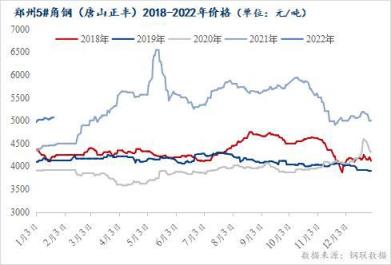 從近五年價格來看,2021年整體價格較往年明顯抬升,以鄭州5#角鋼(唐山正豐)為例,2021年均價較2020同期上升36.96%,最高點為五月份6550元/噸,比2020年十二月份峰值高1950元/噸。進入本月,河南地區型鋼價格小幅上漲,1月份雖然河南多地疫情頻發,交通運輸管控加嚴,下游采購進度受限,整體需求表現不佳,但受到原材料鐵礦及環保政策等因素的影響,價格趨強運行。截止目前,河南疫情得以有效控制,考慮到春節假期過后,下游逐步復工,需求好轉,預計市場價格有一定上漲空間。
