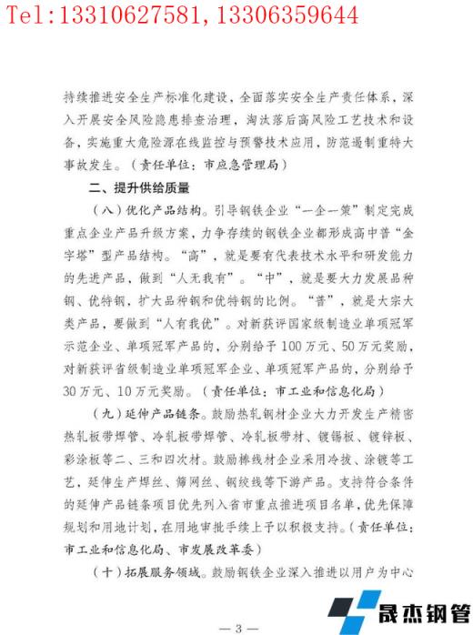 按照"五個一"工作機制,把打造精品鋼鐵為萬億級產業的各項工作落實到各部門、各縣(市、區),結合當地實際,"一企一策"制定具體實施方案。鼓勵和支持更多有能力、有貢獻的鋼鐵企業家加入各級政治組織,廣泛宣傳鋼鐵行業高質量發展的好經驗好做法,維護和提升鋼鐵行業的社會形象。加強輿論監督,及時曝光違法違規行為。建立督導幫扶機制。每月、年底對各涉鋼縣(市、區)精品鋼鐵產業營業收入增速進行排名,對增速前3名的縣(市、區),在爭取配置土地、能耗等要素和環保正面清單準入時予以重點傾斜。