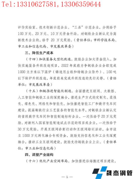 對鋼鐵企業新認定(備案)的國家級、省級、市級技術創新中心、工程研究中心、企業技術中心、重點實驗室、產業技術研究院、工業企業研發機構、產業技術創新戰略聯盟、中小企業公共服務示范平臺、質量控制和技術,評價實驗室、技術創新示范企業、"三品"示范企業,分別給予100萬元、20萬元、10萬元資金補助。對鋼鐵企業新認定為高新技術企業的,給予20萬元獎勵。