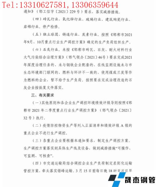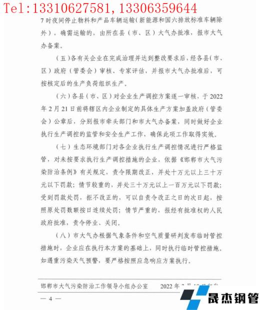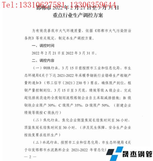 免責聲明:本網站(山東聊城晟杰無縫鋼管廠www.maturesexus.com)刊載的“限產50%!河北一地再發鋼企限產令!即日起至月底!”等均源于網絡,版權歸原作者所有,且僅代表原作者觀點,本文所載信息僅供參考。轉載僅為學習與交流之目的,如無意中侵犯您的合法權益,請及時聯系刪除。本網站刊登此篇文章并不意味著本站贊同其觀點或證實其內容的真實性,我們不對其科學性、嚴肅性等作任何形式的保證。如果侵犯了您的版權,請盡快聯系我們予以撤銷,謝謝合作!