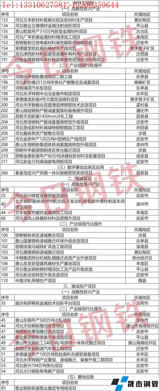 2022年1月4日,經省政府批準,河北省發展改革委印發《河北省2022年省重點建設項目名單》。名單共涉及2022年省重點建設項目共安排695項,總投資1.12萬億元,涵蓋戰略性新興產業、產業鏈現代化提升、數字基礎設施及應用、現代服務業、重大基礎設施等項目類型。這些重點建設項目中,共涉及鋼鐵項目50個。