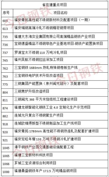 2022年2月25日,福建省發布《2022年重點項目名單》,其中共涉及三鋼、寶鋼、三寶鋼鐵、福建龍鋼、鼎盛鋼鐵等多個鋼企的二十個鋼鐵項目!在這20個項目中,僅不銹鋼項目就有9個,其中包括寶鋼德盛、福安青拓、寶太不銹鋼等龍頭企業提高產能規模、補齊鏈條短板的多個項目,而這也彰顯了福建以龍頭企業為主導,以協作配套項目為依托,推動產業跨區轉移集聚和上下游聯動,打造千億不銹鋼產業集群的重要規劃。