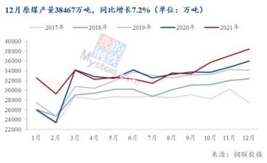 2021年我國原煤產量整體呈現前低后高走勢,尤其10月份增產保供、引導煤價回歸合理區間以來,我國原煤產量連續三個月屢創年內新高。2021年第四季度原煤合計生產11.1億噸,約占全年產量27.3%,其中12月生產原煤3.8億噸,約占全年產量9.5%,保供增產效果顯著。