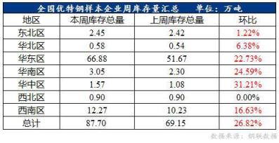 全國(guó)優(yōu)特鋼棒材樣本總庫(kù)存87.7萬(wàn)噸,環(huán)比上升18.55萬(wàn)噸,增幅26.82%。