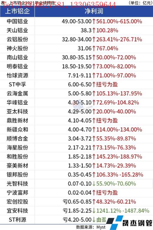 免責聲明:本網站(山東聊城晟杰無縫鋼管廠www.maturesexus.com)刊載的“23家上市鋁企披露2021年業績預報,超8成凈利潤增長”等均源于網絡,版權歸原作者所有,且僅代表原作者觀點,本文所載信息僅供參考。轉載僅為學習與交流之目的,如無意中侵犯您的合法權益,請及時聯系刪除。本網站刊登此篇文章并不意味著本站贊同其觀點或證實其內容的真實性,我們不對其科學性、嚴肅性等作任何形式的保證。如果侵犯了您的版權,請盡快聯系我們予以撤銷,謝謝合作!