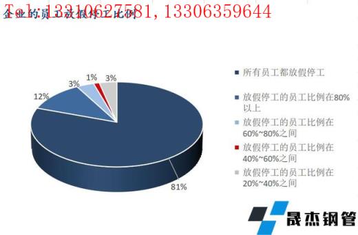 5、樣本企業員工放假停工比例:所有員工都停工放假的企業占比78.65%;放假停工的員工比例在80%以上的企業占比11.24%;放假停工的員工比例在60%~80%的企業占比8%;放假停工的員工比例在40%~60%的企業占比1.12%,放假停工的員工比例在20%~40%的企業占比3.37%,放假停工的員工比例不到20%的企業占比2.25%。