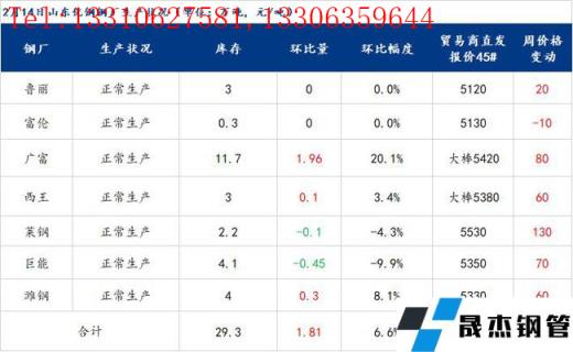 2月14日山東優(yōu)特?zé)o縫厚壁鋼管廠家棒材總庫存29.3萬噸,環(huán)比增加1.81萬噸,增幅6.58%,較去年春節(jié)后第二周庫存增加4.1萬噸。