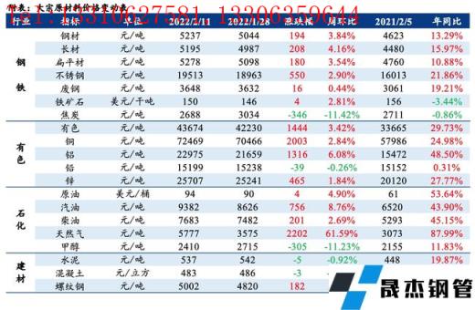 免責聲明:本網站(山東聊城晟杰無縫鋼管廠www.maturesexus.com)刊載的“周報:大宗原材料價格周報(2.07-2.11)”等均源于網絡,版權歸原作者所有,且僅代表原作者觀點,本文所載信息僅供參考。轉載僅為學習與交流之目的,如無意中侵犯您的合法權益,請及時聯系刪除。本網站刊登此篇文章并不意味著本站贊同其觀點或證實其內容的真實性,我們不對其科學性、嚴肅性等作任何形式的保證。如果侵犯了您的版權,請盡快聯系我們予以撤銷,謝謝合作!
