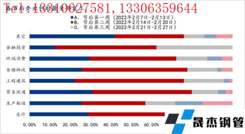 對1600余家部分復工和未復工企業的調研分析顯示,節后第一周(2022年2月7日-2月13日)比例為28.80%,較去年下降了35個百分點;節后第二周(2022年2月14日-2月20日)比例為43.70%,較去年上升了18個百分點;節后第三周(2022年2月21日-2月27日)復工的比例為14.34%,較去年上升了10個百分點;節后第四周或以后(2022年2月28日及以后)比例為6.55%、暫未確定的有6.61%,和去年差別不是很大。對比去年來看,今年復工進度則主要集中在第2-3周,慢了10天左右,可能與今年春節要早于去年有一定關系。