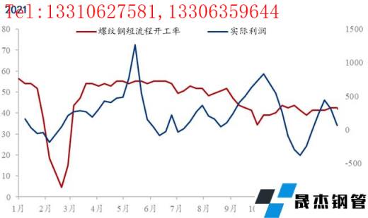 而對于2021年的數據來說無論是相關分析還是回歸分析結果表現出與其他年份有不同的結果,這與2021年的特殊情況有關。由于2021年螺紋鋼價格的急劇變化,導致電弧爐實際利潤具有了極強的波動性,而且由于能耗雙控,從8月底電弧爐無縫厚壁鋼管廠家被嚴格限產,導致了電弧爐開工率有近20%左右的持續下降,創造了歷史低位,政策以及成材價格變動明顯干擾了數據的觀測,如下圖所示: