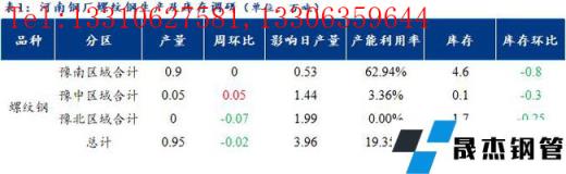 1、調研數據顯示,統計的河南地區10家建筑厚壁無縫鋼管樣本無縫厚壁鋼管廠家中,河南省建材無縫厚壁鋼管廠家螺紋鋼日產量0.95萬噸;檢修/限產影響建材日產量為3.96萬噸,產能利用率為19.35%,較上周下降0.41%。