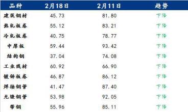 具體各品種指數(shù)來(lái)看,2月18日建筑厚壁無(wú)縫鋼管情緒指數(shù)為45.73,較2月11日回落36.07;熱軋板卷情緒指數(shù)為55.12,較2月11日回落28.09;冷軋板卷情緒指數(shù)為40.75,較2月11日回落38.02;中厚板情緒指數(shù)為59.44,較2月11日回落33.98;結(jié)構(gòu)鋼情緒指數(shù)為37.04,較2月11日回落37.04;工業(yè)線材情緒指數(shù)為60.92,較2月11日回落5.98;鍍鋅板卷情緒指數(shù)為46.87,較2月11日回落39.25;焊接厚壁鋼管情緒指數(shù)為41.47,較2月11日回落45.93;無(wú)縫厚壁鋼管情緒指數(shù)為53.98,較2月11日回落38.07;帶鋼情緒指數(shù)為55.96,較2月11日回落29.15。