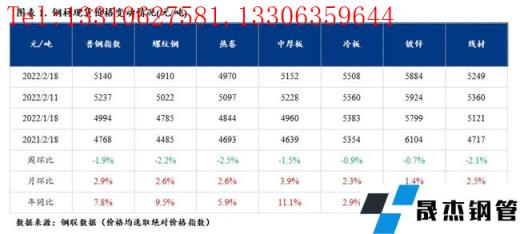 本周普鋼價(jià)格指數(shù)小幅下跌。截至2月18日,普鋼價(jià)格指數(shù)報(bào)5140點(diǎn),環(huán)比跌1.9%;螺紋鋼報(bào)4910元/噸,環(huán)比上周跌2.2%元/噸。本周厚壁無(wú)縫鋼管價(jià)格結(jié)束上漲出現(xiàn)回落,原因在于驅(qū)動(dòng)價(jià)格上漲的邏輯出現(xiàn)變化。