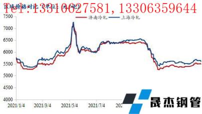 2021年上海冷軋板卷最高價7250元/噸,最低價5360元/噸,均價6014元/噸,全年高低價差1890元/噸。濟(jì)南冷軋板卷最高價7170元/噸,最低價5250元/噸,均價5914元/噸,全年高低價差1920元/噸。同一交易日上海-濟(jì)南冷軋價差全年最高240元/噸,最低-250元/噸,均價99元/噸。