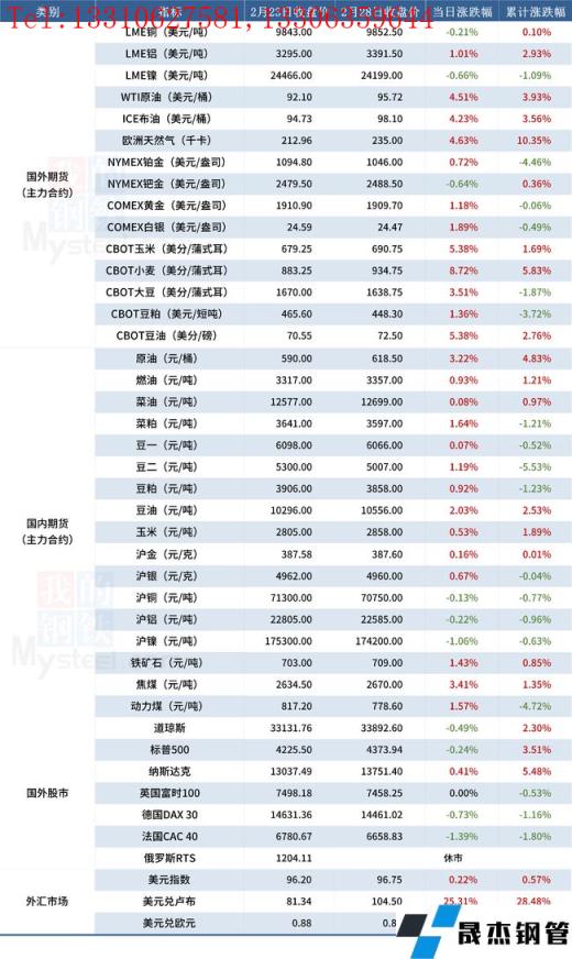免責聲明:本網站(山東聊城晟杰無縫鋼管廠www.maturesexus.com)刊載的“受近期局勢影響大宗商品價格一覽表(2月28日)”等均源于網絡,版權歸原作者所有,且僅代表原作者觀點,本文所載信息僅供參考。轉載僅為學習與交流之目的,如無意中侵犯您的合法權益,請及時聯系刪除。本網站刊登此篇文章并不意味著本站贊同其觀點或證實其內容的真實性,我們不對其科學性、嚴肅性等作任何形式的保證。如果侵犯了您的版權,請盡快聯系我們予以撤銷,謝謝合作!