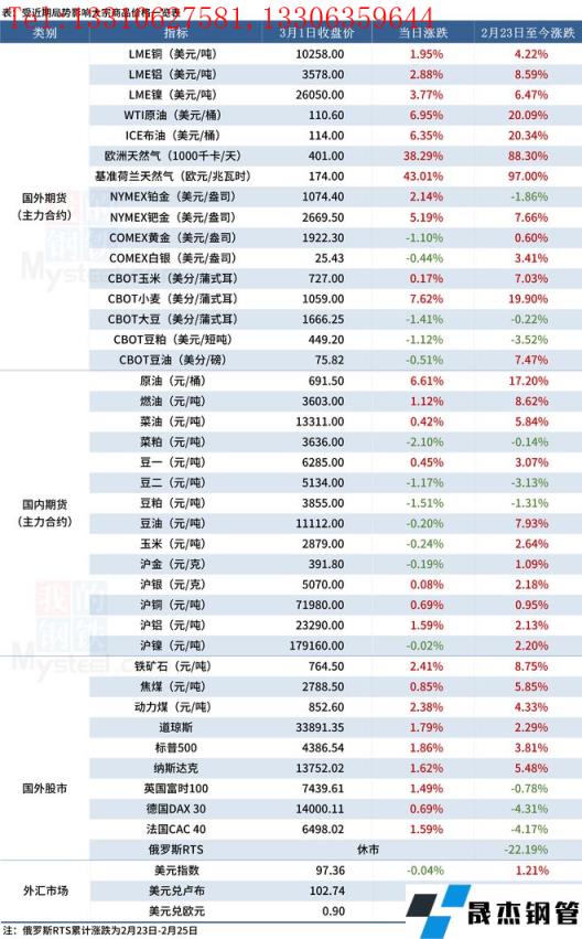 近期,受國際局勢影響,全球金融及大宗商品市場出現較大波動。3月2日,多個大宗商品價格創多年新高,天然氣累計漲幅超80%,原油突破110美金。匯總情況如下: