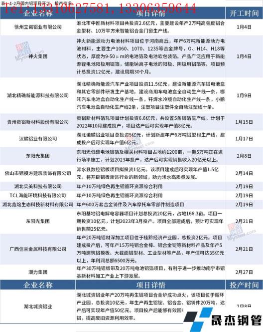 免責聲明:本網站(山東聊城晟杰無縫鋼管廠www.maturesexus.com)刊載的“1-2月國內鋁項目開工、投產情況”等均源于網絡,版權歸原作者所有,且僅代表原作者觀點,本文所載信息僅供參考。轉載僅為學習與交流之目的,如無意中侵犯您的合法權益,請及時聯系刪除。本網站刊登此篇文章并不意味著本站贊同其觀點或證實其內容的真實性,我們不對其科學性、嚴肅性等作任何形式的保證。如果侵犯了您的版權,請盡快聯系我們予以撤銷,謝謝合作!