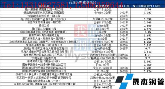 未來2-3年福建省高速公路在建新建線路總長約668.978公里,據不完全統計預計總用鋼量約30.235萬噸左右。