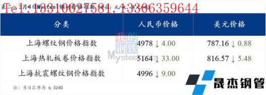 3月4日普鋼絕對(duì)價(jià)格指數(shù)變化:綜合指數(shù)5226.82,上漲0.36;螺紋鋼指數(shù)4954.04,下跌3.31;線材指數(shù)5293.86,下跌0.84;熱軋板卷指數(shù)5160.14,下跌13.7;冷軋板卷指數(shù)5589.59,上漲19.12;中厚板指數(shù)5199.28,上漲12.44。