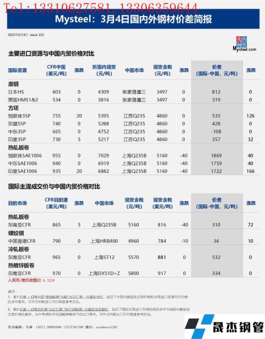 免責聲明:本網站(山東聊城晟杰無縫鋼管廠www.maturesexus.com)刊載的“2022年03月04日日報:國內外鋼材_無縫鋼管價差匯總(2022.3.4)”等均源于網絡,版權歸原作者所有,且僅代表原作者觀點,本文所載信息僅供參考。轉載僅為學習與交流之目的,如無意中侵犯您的合法權益,請及時聯系刪除。本網站刊登此篇文章并不意味著本站贊同其觀點或證實其內容的真實性,我們不對其科學性、嚴肅性等作任何形式的保證。如果侵犯了您的版權,請盡快聯系我們予以撤銷,謝謝合作!