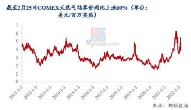 受俄烏沖突影響,截至2月25日,COMEX天然氣結(jié)算價(jià)4.485美元/百萬(wàn)英熱,同比上漲60%。整個(gè)2月天然氣均價(jià)約為4.459,環(huán)比上漲12%,同比上漲54%,為2014年后的第二高點(diǎn)。