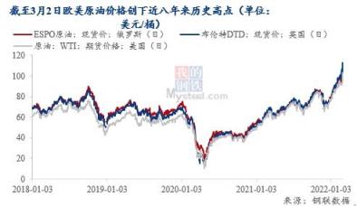 除了天然氣,原油也是俄羅斯主要出口能源類型之一。今年2月,俄羅斯的石油產(chǎn)量同比增長(zhǎng)9.3%,達(dá)到1105.5萬(wàn)桶/日。在俄烏沖突之下,原油價(jià)格飆升。截至3月2日,美油價(jià)格一度沖破了111美元/桶,布油價(jià)格一度接近113美元/桶,布油美油的價(jià)格都創(chuàng)近8年新高。