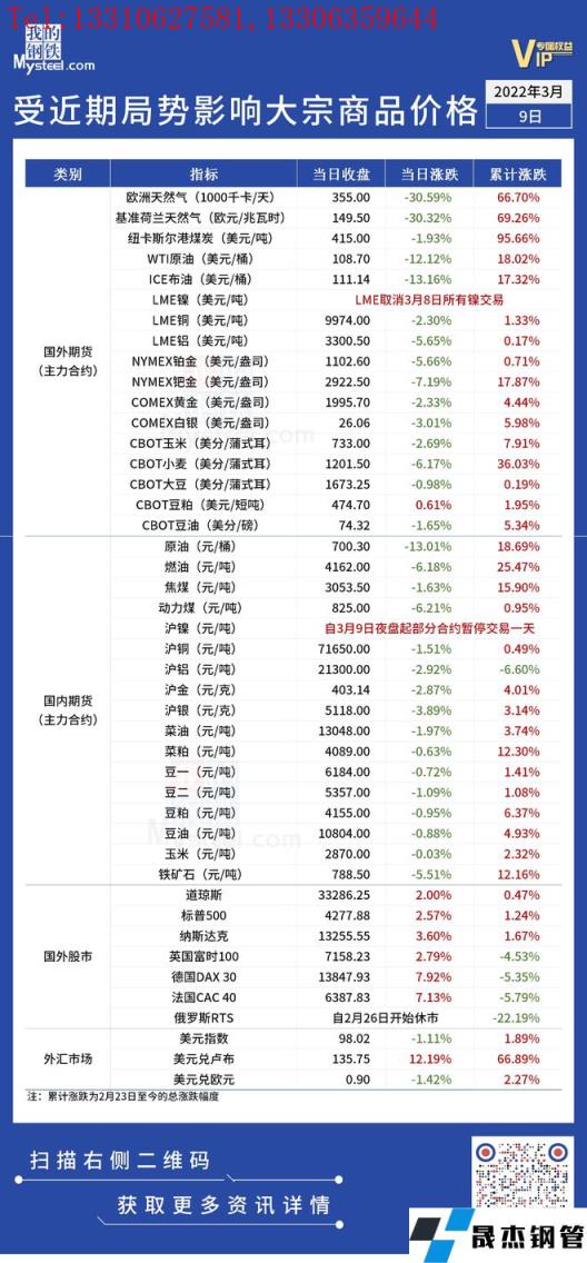 近期,受國際局勢(shì)影響,全球金融及大宗商品市場(chǎng)出現(xiàn)較大波動(dòng)。3月9日,伴隨俄烏局勢(shì)出現(xiàn)緩和跡象,能源和有色金屬上演了行情“大反轉(zhuǎn)”,歐美股市則大幅上漲。匯總情況如下: