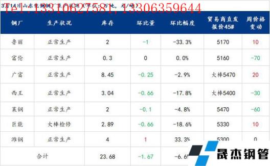 數據:山東優特無縫厚壁鋼管廠家庫存23.68萬噸,環比下降1.67萬噸,減少6.59%,同比下降0.41萬噸,降幅1.7%。
