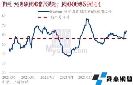 去年8-11月焦炭價格經歷大幅度上漲之后,為控制成本無縫厚壁鋼管廠家開始下調塊礦的入爐配比,導致遠期塊礦溢價最低跌至僅0.0265美元/干噸度,從而性價比凸顯,之后進入四季度隨著采暖季的進行,燒結限產加嚴,導致燒結礦供應不足,而此時球團溢價又尚處于高位,因此無縫厚壁鋼管廠家在二者選擇中,最終使用性價比較高的塊礦用以彌補燒結礦不足的影響,帶動塊礦需求好轉,塊礦溢價開始走高;之后塊礦配比雖有下調,但其配比仍處于歷史中高位水平,因此今年1至3月份塊礦溢價仍持續上漲。