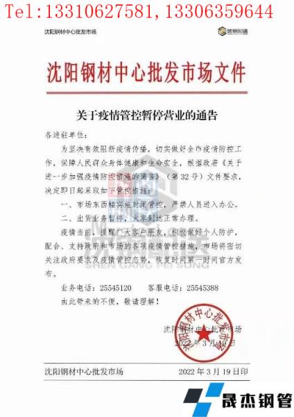 目前沈陽厚壁無縫鋼管中心批發市場已發布通告,19日起北一西路東西樓試試封閉管控、嚴禁人員進入辦公,出庫業務暫停、火車到達正常辦理;中國兵工物資125庫通告19日起嚴禁人員進入庫區辦公,出庫業務暫停、火車到達正常辦理;國家糧食和物資儲備局遼寧局二三九處通告19日起辦公樓嚴禁進出,庫內所有出入庫業務暫停、火運到達正常辦理。市內其他主要厚壁無縫鋼管市場反饋暫時正常辦公及出庫,但從防控指揮部通告內容來看、也有暫停營業的傾向。(通告見文末圖片)