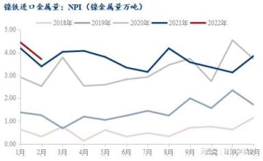 2月環比下降主因是自然天數少加之春節假期的影響。3月倫鎳經歷大起大落,國內市場純鎳、水淬鎳供應緊張,價格高企,300系不銹鋼高含量鎳原料中印尼鎳鐵占據經濟性優勢,3月300系粗鋼排產環比增加至151萬噸,對應鎳需求預期增加,吸引印尼鎳鐵回流,預計3月鎳鐵進口量呈現上行趨勢。