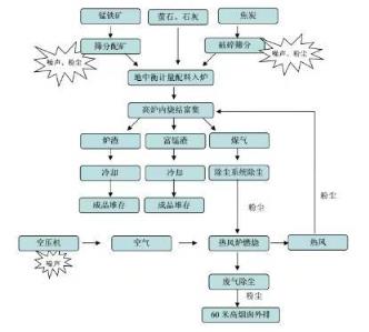 富錳渣生產(chǎn)線整個(gè)工藝系統(tǒng)由原材料入廠、儲(chǔ)存、電子稱稱量、皮帶輸送機(jī)上料、布料小車布料、高爐還原冶煉、鐵水包,成品入庫(kù)及成品發(fā)放等組成。在生產(chǎn)過程中排出大量的高溫含塵煙氣,煙氣主要成份是煤氣,所產(chǎn)生的煙塵是要是爐塵和瓦斯泥。