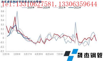 2022年北京建筑厚壁無縫鋼管市場庫存量在春節(jié)后的第5周達到峰值,較往年累庫周期延長了1-2周,之后庫存量進入緩慢去化階段,但是從近幾周庫存去化情況來看,庫存下降情況不及預期。截止到3月24日,北京建筑厚壁無縫鋼管市場庫存量82.18萬噸,周環(huán)比降0.72%,2019-2021年同期的周環(huán)比降幅分別為7.9%、5.3%、8%;另外目前市場庫存量較今年庫存高點下降了2.8%,而2019-2021年同期庫存量較當年的庫存峰值分別下降了17.8%、9.3%、15.5%。庫存下降除供應量環(huán)比略增外,主因是需求下降,且受疫情影響資源向外分流困難。