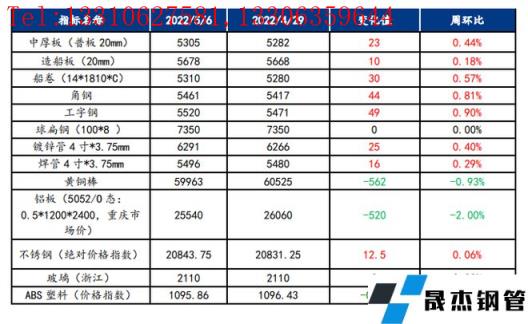 截止2022年5月6日,各原材料當日即時價格以及價格周環比情況如下: