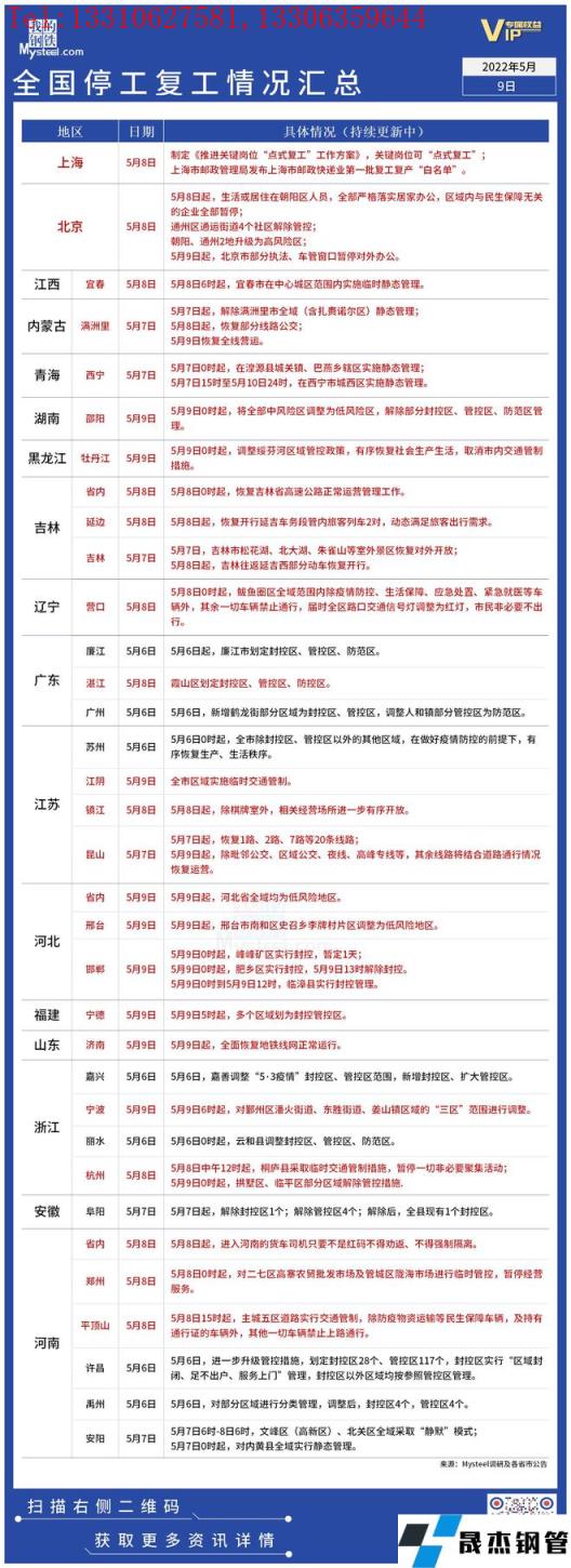 免責聲明:本網站(山東聊城晟杰無縫鋼管廠www.maturesexus.com)刊載的“疫情影響丨全國停工復工情況匯總(5月9日)”等均源于網絡,版權歸原作者所有,且僅代表原作者觀點,本文所載信息僅供參考。轉載僅為學習與交流之目的,如無意中侵犯您的合法權益,請及時聯系刪除。本網站刊登此篇文章并不意味著本站贊同其觀點或證實其內容的真實性,我們不對其科學性、嚴肅性等作任何形式的保證。如果侵犯了您的版權,請盡快聯系我們予以撤銷,謝謝合作!
