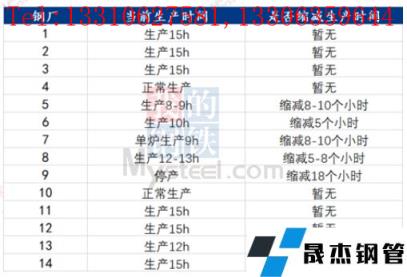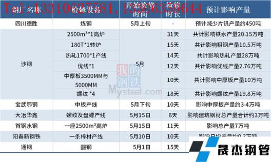 據(jù)不完全統(tǒng)計(jì),截至5月12日,國內(nèi)7家無縫厚壁鋼管廠家發(fā)布檢修計(jì)劃。其中,檢修時(shí)間最長的是沙鋼 ,2500m3*1高爐檢修31天,共計(jì)影響鐵水產(chǎn)量20.15萬噸。