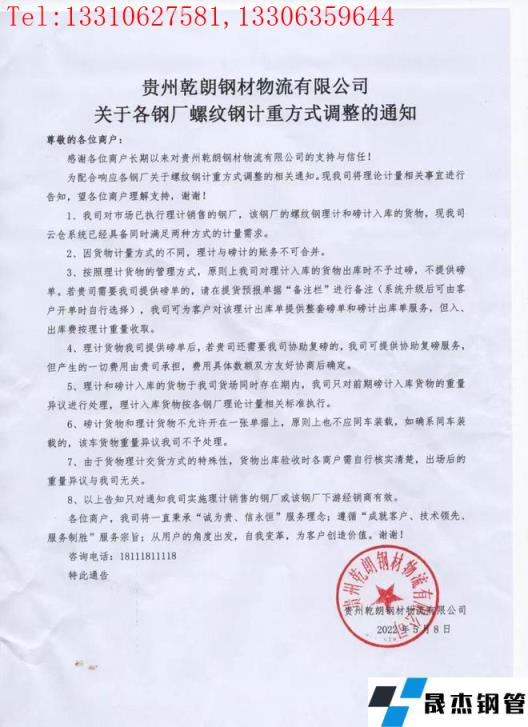 免責聲明:本網站(山東聊城晟杰無縫鋼管廠www.maturesexus.com)刊載的“貴州乾朗鋼材_無縫鋼管物流有限公司關于各無縫鋼管廠家螺紋鋼計重方式調整的通知”等均源于網絡,版權歸原作者所有,且僅代表原作者觀點,本文所載信息僅供參考。轉載僅為學習與交流之目的,如無意中侵犯您的合法權益,請及時聯系刪除。本網站刊登此篇文章并不意味著本站贊同其觀點或證實其內容的真實性,我們不對其科學性、嚴肅性等作任何形式的保證。如果侵犯了您的版權,請盡快聯系我們予以撤銷,謝謝合作!