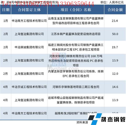 據(jù)中國中冶消息,2022年1-4月新簽合同額人民幣4057.3億元,較上年同期增長12.2%。其中10億元以上的重大鋼鐵工程承包合同8個,合同金額160.3億元,具體項目明細如下: