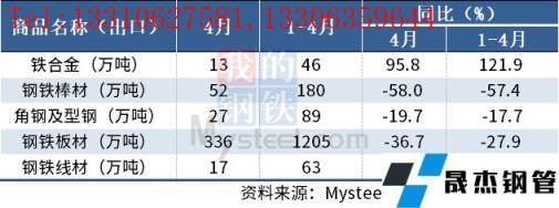 4月,中國(guó)出口鋼鐵棒材52萬噸,同比下降58.0%;1-4月累計(jì)出口180萬噸,同比下降57.4%。其他出口情況如下表所示: