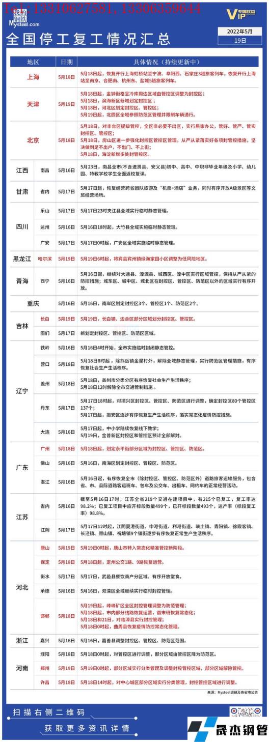 截至5月19日,據(jù)不完全統(tǒng)計(jì),共有16個(gè)省份發(fā)布了停工復(fù)工最新信息。北京多地強(qiáng)化封控區(qū)管控區(qū)管理。天津多地調(diào)整為封控區(qū)。上海再恢復(fù)開(kāi)行8趟列車(chē)。唐山轉(zhuǎn)入常態(tài)化精準(zhǔn)管控新階段。具體情況如下: