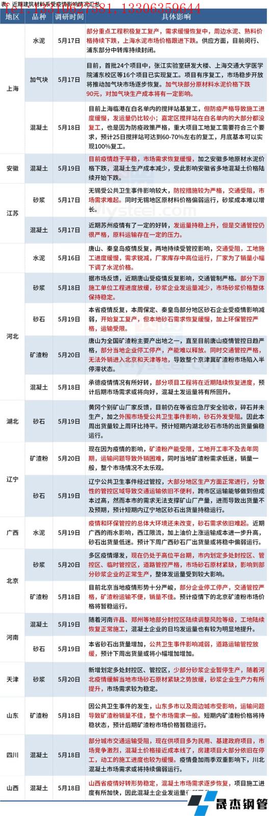 截至5月20日,據百年建筑網調研,14個省份建材市場受到了不同程度的影響。隨著華東、華南疫情和暴雨情況的緩解,物流運輸逐步恢復正常,材料進場速度加快,下游工地施工節奏提升。在疫情有效管控下,基建、房建方面的需求陸續回升,但由于疫情反復抬頭的影響,仍有上行空間有限。具體情況如下: