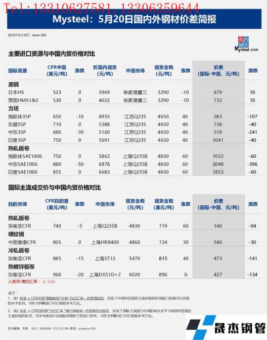 免責聲明:本網站(山東聊城晟杰無縫鋼管廠www.maturesexus.com)刊載的“2022年05月20日日報:國內外鋼材_無縫鋼管價差匯總(2022.5.20)”等均源于網絡,版權歸原作者所有,且僅代表原作者觀點,本文所載信息僅供參考。轉載僅為學習與交流之目的,如無意中侵犯您的合法權益,請及時聯系刪除。本網站刊登此篇文章并不意味著本站贊同其觀點或證實其內容的真實性,我們不對其科學性、嚴肅性等作任何形式的保證。如果侵犯了您的版權,請盡快聯系我們予以撤銷,謝謝合作!