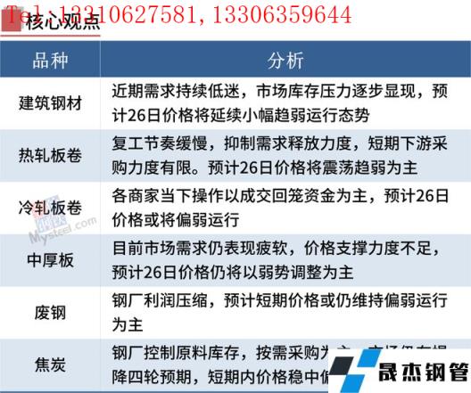 中厚板:5月25日,全國24個主要城市20mm普板均價5115元/噸,較上一交易日下跌19元/噸。盤面震蕩為主,市場心態延續偏弱,加上目前下游采購積極性不高,多數貿易商報價逐步小幅探跌。成交方面,在下跌行情下,多數市場成交表現不佳。資源方面,雖目前南北價差稍有修復,但多數商家對于后市仍相對偏空,現主動備貨意愿不強。綜合來看,目前市場需求仍表現疲軟,價格支撐力度不足,預計26日全國中厚板價格仍將以弱勢調整為主。