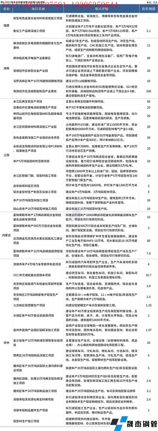 免責聲明:本網站(山東聊城晟杰無縫鋼管廠www.maturesexus.com)刊載的“5省2022年鋁相關重點招商項目清單出爐”等均源于網絡,版權歸原作者所有,且僅代表原作者觀點,本文所載信息僅供參考。轉載僅為學習與交流之目的,如無意中侵犯您的合法權益,請及時聯系刪除。本網站刊登此篇文章并不意味著本站贊同其觀點或證實其內容的真實性,我們不對其科學性、嚴肅性等作任何形式的保證。如果侵犯了您的版權,請盡快聯系我們予以撤銷,謝謝合作!