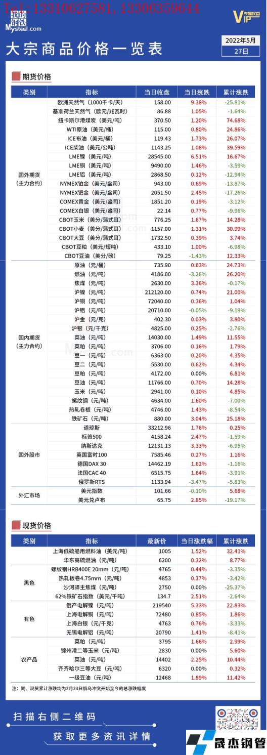 免責聲明:本網站(山東聊城晟杰無縫鋼管廠www.maturesexus.com)刊載的“俄烏局勢丨大宗商品價格一覽表(5月27日)”等均源于網絡,版權歸原作者所有,且僅代表原作者觀點,本文所載信息僅供參考。轉載僅為學習與交流之目的,如無意中侵犯您的合法權益,請及時聯系刪除。本網站刊登此篇文章并不意味著本站贊同其觀點或證實其內容的真實性,我們不對其科學性、嚴肅性等作任何形式的保證。如果侵犯了您的版權,請盡快聯系我們予以撤銷,謝謝合作!