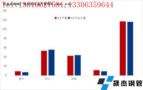 四川區域:五月四川區域無縫厚壁鋼管廠家線材實際產量53.27萬噸,六月計劃產量56萬噸,計劃產量增加2.73萬噸,環比增加5.12%。其中LG5月30號開始恢復正常生產,產量有所增加。