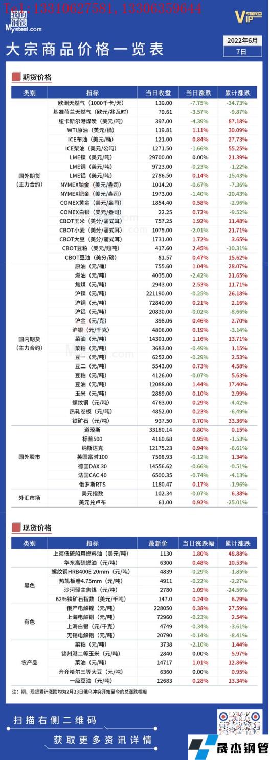 免責聲明:本網站(山東聊城晟杰無縫鋼管廠www.maturesexus.com)刊載的“俄烏局勢丨大宗商品價格一覽表(6月7日)”等均源于網絡,版權歸原作者所有,且僅代表原作者觀點,本文所載信息僅供參考。轉載僅為學習與交流之目的,如無意中侵犯您的合法權益,請及時聯系刪除。本網站刊登此篇文章并不意味著本站贊同其觀點或證實其內容的真實性,我們不對其科學性、嚴肅性等作任何形式的保證。如果侵犯了您的版權,請盡快聯系我們予以撤銷,謝謝合作!